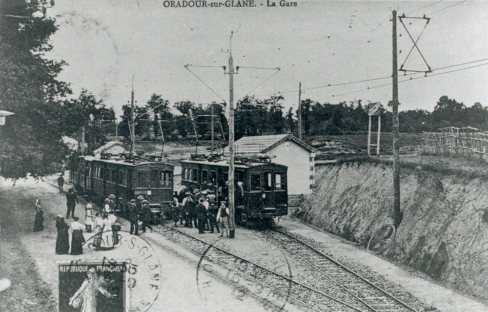 A Oradour, le tramway est fortement présent, par les vestiges de son implantation. Le village est traversé par une voie ferrée ; le croisement des tramways se faisant au niveau de la gare. Celle-ci et une petite halle à marchandise se situent au nord du village. La ligne passant par Oradour faisait partie d'un réseau de près de 350 km de voie métrique implantés en Haute-Vienne. L'idée d'un réseau de tramway fut émise en 1881 au cours d'une session du Conseil Général. La construction d'un réseau urbain commence à Limoges en 1895. Il est inauguré deux ans plus tard. En 1897, un projet prévoit cinq lignes à voie métrique et à traction mécanique : 1 - Limoges - Aixes-sur-Vienne 2 - Limoges - Oradour-sur-Glane et Mézière-sur-Issoire 3 - Limoges - Saint paul d'Eyjeaux 4 - Limoges - Bessines 5 - Limoges - Saint Sulpice-les-Feuilles Une première ligne de 11,2 km est ouverte en janvier 1908. Elle est confiée, en 1911 à la Compagnie des Chemin de Fer de la Haute-Vienne (CDHV). Après des études pour l'élaboration du réseau dans le département, le tracédéfinitif est établis par l'ingénieur des Ponts et Chaussées ainsi que le sénateur Vacherie. Finalement ce sera quatre lignes :