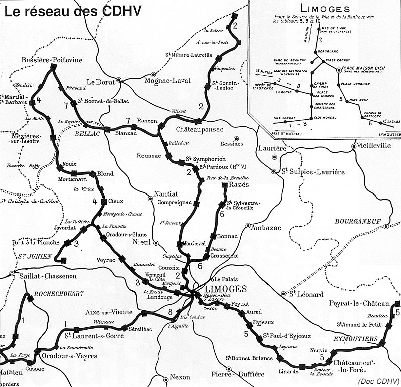 1 - Limoges - Saint Mathieu avec embranchement sur Rochechouart. 2 - Limoges - Saint Sulpice-les-Feuilles avec embranchement de Rançon à Bussière-poitevine. 3 - Limoges - Oradour-sur-Glane et Bussière-Poitevine avec embranchement sur Saint Junien. 4 - Limoges - Eymoutiers et Peyrat-le-Château. La concession est accordée pour une durée de 65 ans, le 17 mars 1909, à messieurs Giros et Loucheur, ingénieurs, qui créent une société anonyme, la Compagnie des Chemins de Fer de la Haute-Vienne.